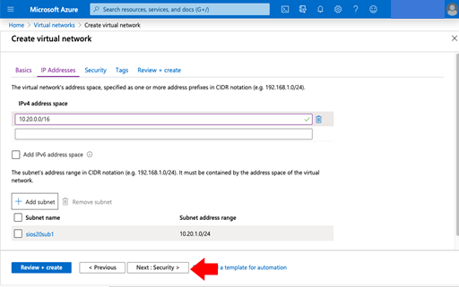 - The new subnet (sios20sub1) will appear. Click Next: Security.