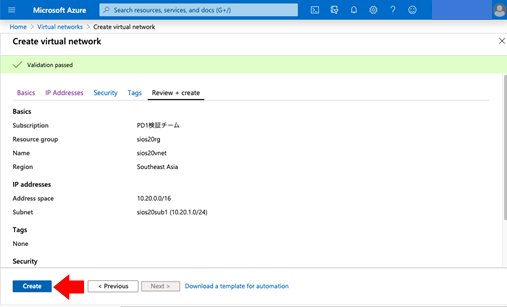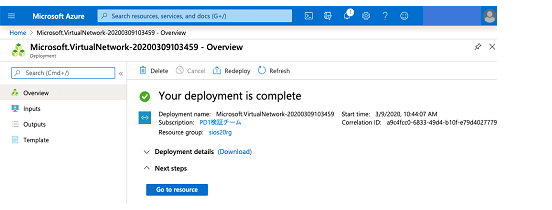 - When sios20vnet and sios20sub1 are created and the creation process is completed, the following window is displayed.