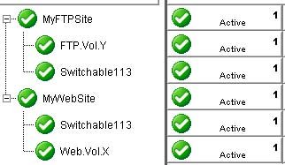 For example, the hierarchy shown below shows both MyFTPSite and MyWebSite utilizing the same IP address and different volume resources. Any maintenance done on one site will affect the other site since these have common IP resource dependency.