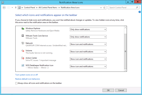Note: By default, Microsoft Windows will hide Notification Tray Icons. You can change this by going to the ‘Notification Area Icons’ option in Control Panel and changing the settings for the DataKeeper Notification Icon to ‘Show icon and notifications’