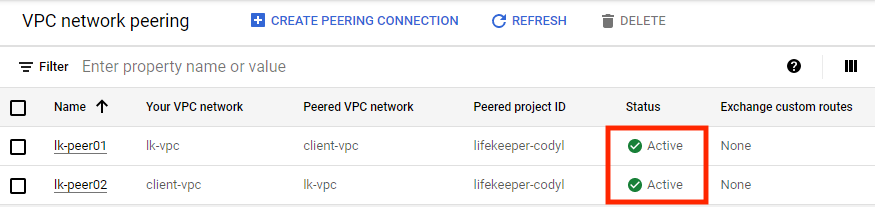 - 以下の 2 つの VPC ピアリングが作成されました。両方が Active ステータスであることを確認してください。