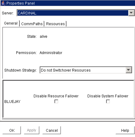 - [一般] タブをクリックします。 [サーバプロパティ] ダイアログボックスの [フェイルオーバ] セクションに移動し、システムとリソースのフェイルオーバ機能を無効にするサーバを確認します。SIOS Protection Suite のフェイルオーバ機能はデフォルトで有効に設定されています。