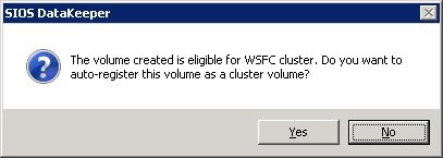 - At the completion of the mirror creation operation, the following dialog box will pop up which will allow you to automatically add the mirror as a DataKeeper volume resource into WSFC.