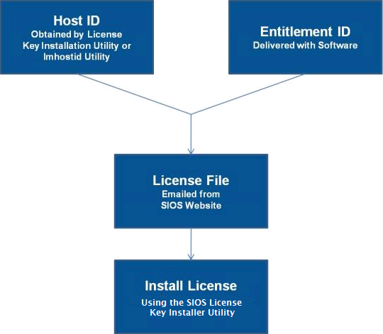 The final screen of the InstallShield installation utility displays the Host ID of your server. The Host ID, along with the Entitlement ID (Authorization Code) that was provided with your LifeKeeper for Windows software is used to obtain the license. The process is illustrated below.