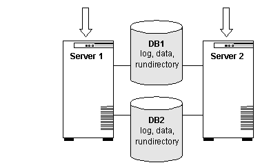 - Initially, Server 1 runs DB1 and Server 2 runs DB2. In a switchover situation, one server can run both databases.