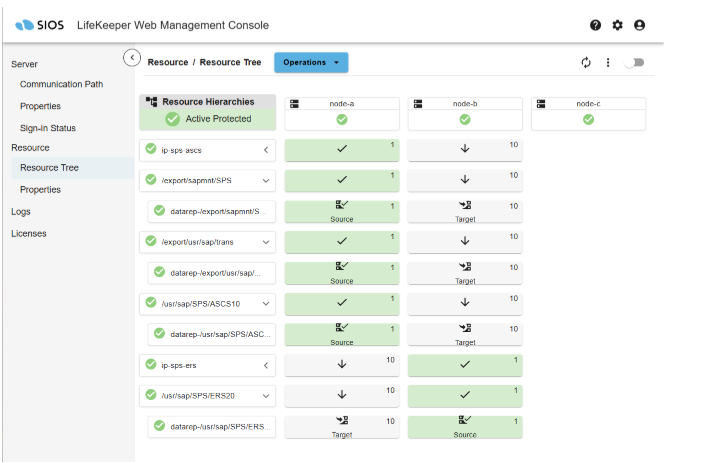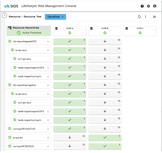 Once the NFS resource hierarchies have been created successfully, the LifeKeeper GUI should resemble the following image. Note that the names of the resources used to protect the ASCS and ERS instance virtual host names may differ depending on which subsection of Create ASCS and ERS Virtual IPs was followed.