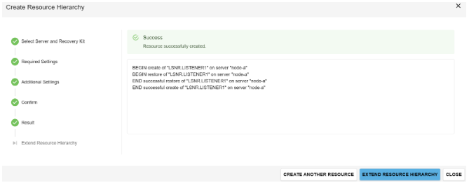 - The Extend Wizard reviews the values and extends the Listener Resource to Node-B. Once the configuration is completed, select “CLOSE”.