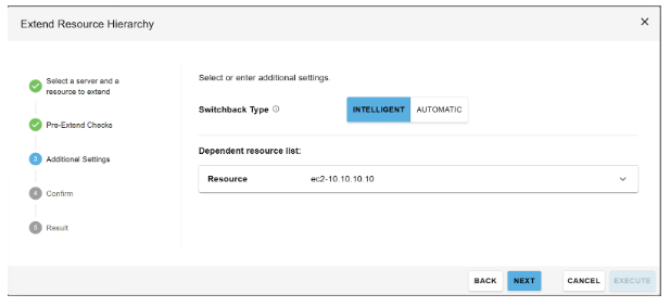 - After the resource has been created, click the “Extend Resource Hierarchy” button. You will then be prompted to select the target server and target priorities.