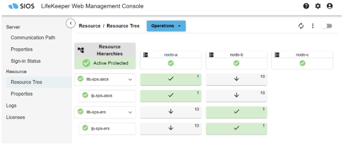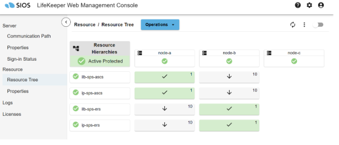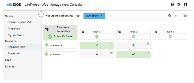 - Following the steps described in Creating an IP Resource, use the following parameters to create and extend two LifeKeeper IP resources (ip-sps-ascs and ip-sps-ers), each with net mask 255.255.255.255, to protect the ASCS and ERS virtual IP addresses on node-a and node-b. Notice that ip-sps-ascs is created on node-a and extended to node-b, while ip-sps-ers is created on node-b and extended to node-a. Also note that the resulting resources should not be extended to node-c, the witness node. The