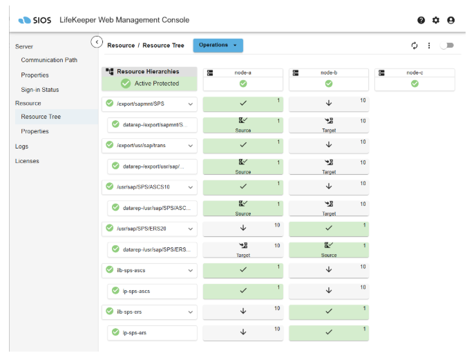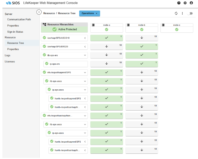 Add the line ‘SAP_NFS_CHECK_DIRS=/sapmnt/SPS’ to /etc/default/LifeKeeper on node-a and node-b to allow the SAP Recovery Kit to monitor the availability of the sps-ascs:/export/sapmnt/SPS NFS share before performing administrative tasks that require access to files found on the shared file system.