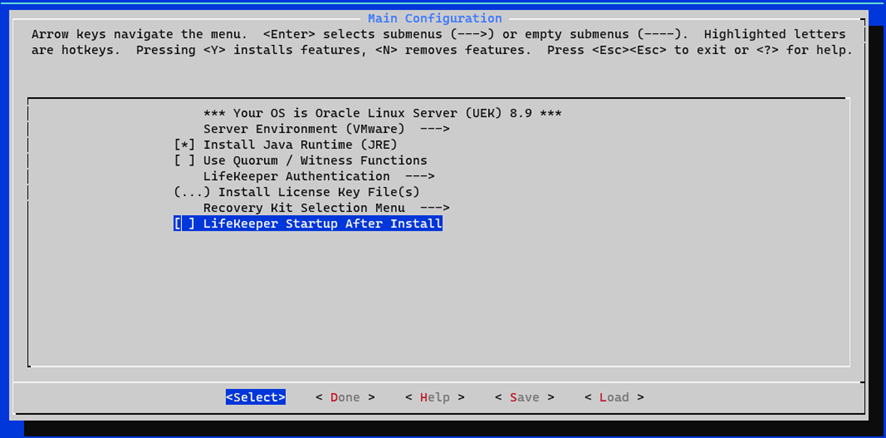 Note that features for protecting virtual IP addresses, file systems (such as shared disks without replication or multipathing), and other components will be installed regardless of whether they are selected on this screen. - LifeKeeper Startup After Install: This option appears when specifying a license in “Install License Key File(s)”. Selecting this option will launch LifeKeeper for Linux immediately after installation completes. If you do not select this option, use the LifeKeeper startup method described later to start LifeKeeper.