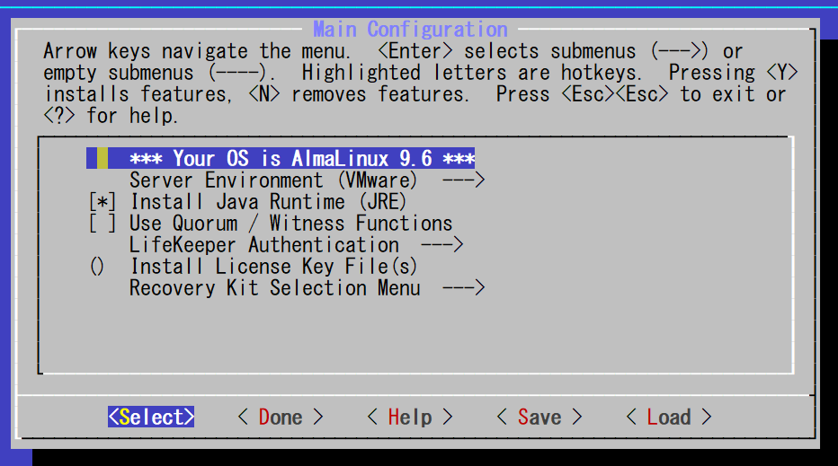 - Install Java Runtime (JRE): Select this option when using the legacy Java-based GUI. The Java used by LifeKeeper refers to the LifeKeeper configuration file (/etc/default/LifeKeeper). Since it does not use OS environment variables, multiple Java versions can coexist. The presence of both the product-bundled Java package and other Java packages does not affect LifeKeeper’s operation. Note that this option will not be displayed if a JRE is already installed.