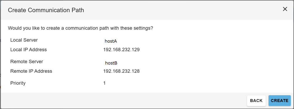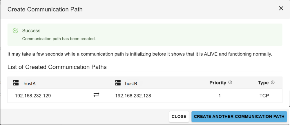Click Create Another Communication Path on the creation results screen to create communication paths consecutively. To finish configuring communication paths, click CLOSE.