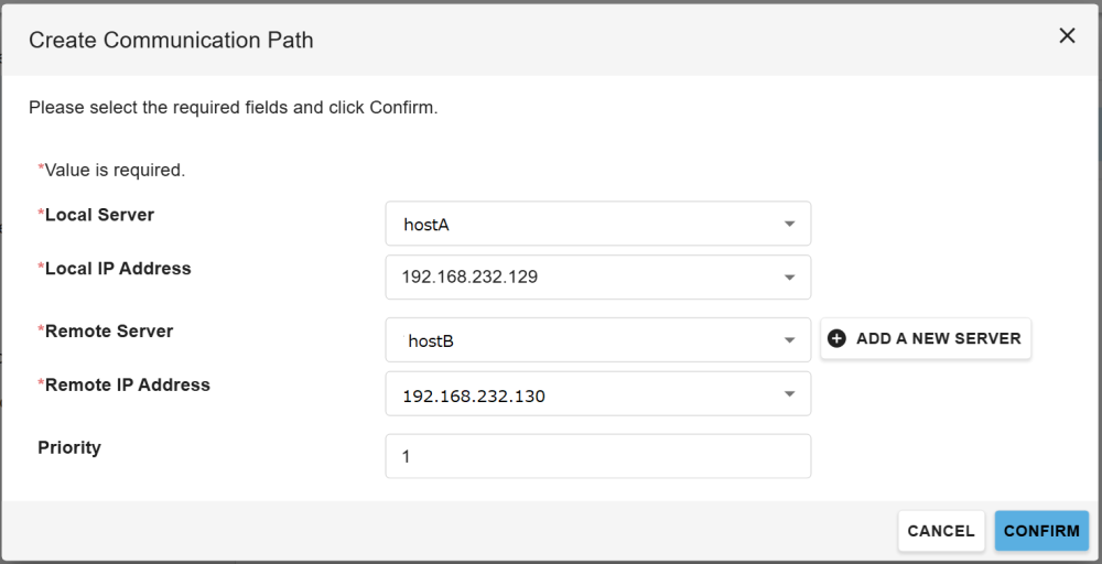 Select the remote server for which to create the communication path. If the destination server is not displayed in the drop-down menu, press the ADD A NEW SERVER button to the right of the Remote Server field.- In the form that appears after pressing Add a New Server, enter the IP address or host name of the server to be added and click Confirm.