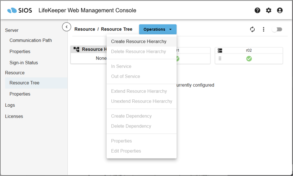 To create a resource, click Operations on the Resource Tree screen and select Create Resource Hierarchy from the drop-down list.