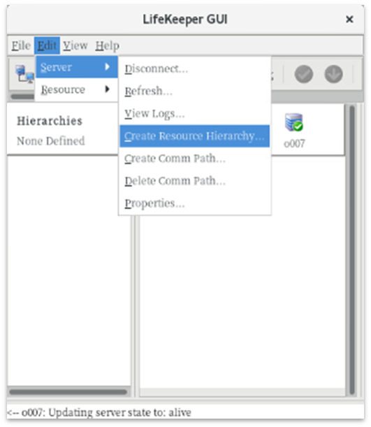 Once you have confirmed that the conditions for creating a file system resource are met, launch the wizard for creating the file system resource in the GUI client. To launch the wizard, select Edit from the GUI client toolbar, then select Server > Create Resource Hierarchy.