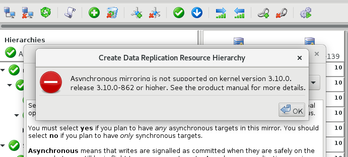 | Enable Asynchronous Replication? | Select Yes to allow this replication resource to support asynchronous replication to target systems. Select No if you will use synchronous replication to all targets. You will be asked later to choose the actual type of replication, asynchronous or synchronous, when the replication resource is extended to each target server. (See Mirroring with SIOS DataKeeper for a discussion of both replication types.) If you want the replication to any of these targets to be performed asynchronously, you should choose Yes here, even if the replication to other targets will be done synchronously. Note: If you select asynchronous mirroring in an environment where asynchronous mirroring is not supported, the following message is displayed. Asynchronous mirroring is not supported on kernel version 3.10.0 release 3.10.0-862 or higher. |