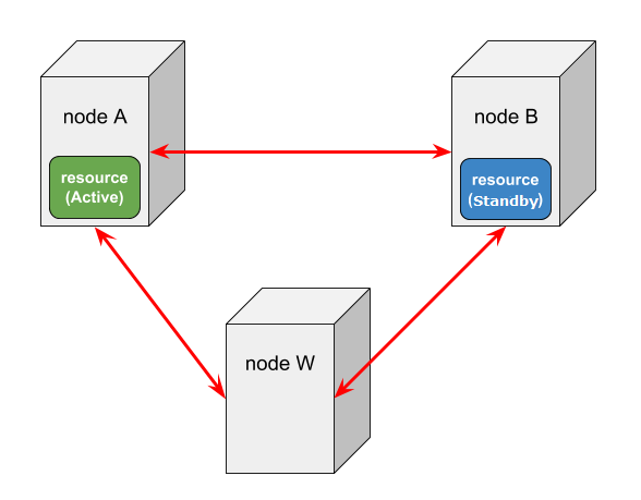 Since all nodes can and will act as witness nodes when the quorum/witness package is installed, this scenario is the same as the previous. In this case, Node A and Node W will determine that the other is still alive by consulting with Node B.