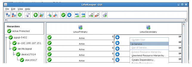 - From the LifeKeeper GUI, right click on the PostgreSQL resource on the Secondary Server (LINUXSECONDARY) and choose IN SERVICE.