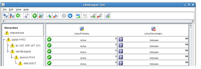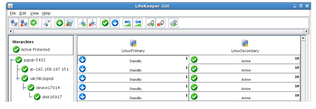 - Using the LifeKeeper GUI, verify that the PostgreSQL and dependent resources are active on LINUXSECONDARY.