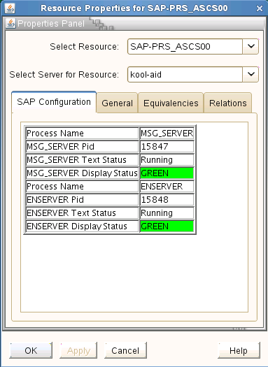 The Resource Properties page allows you to view the configuration details for a specific SAP resource. To view the properties of a resource on a specific server or display the status of SAP processes, view the Properties Screen: