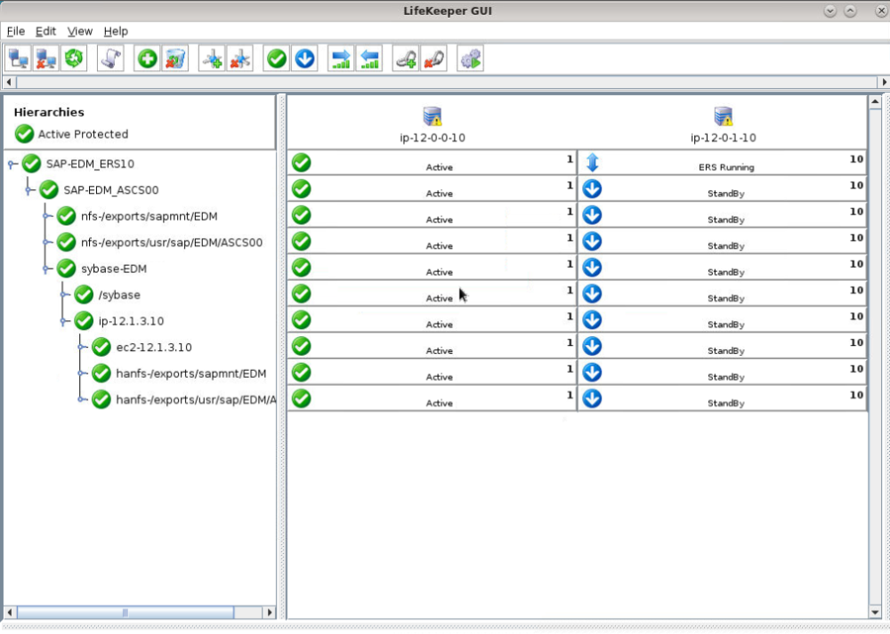 ERSリソースがバックアップノードのLifeKeeperでアクティブ(ISP)になると、ERSインスタンスは、利用可能になったときに元のプライマリノードで起動します。その時点で、レプリケーションサーバーはエンキューサーバーに再接続し、ロックテーブルのレプリケーションを再開します。ERSインスタンスがバックアップノードで実行されている場合、LifeKeeper GUIのステータスは「StandBy」から「ERS Running」に変わります。