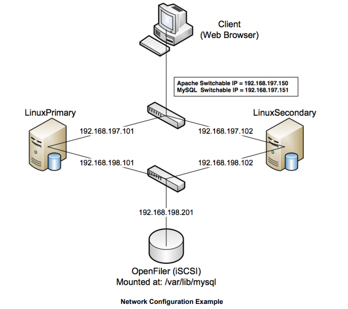 In this example evaluation scenario we will be leveraging both local, replicated storage (with the Apache configuration) as well as Shared Storage (iSCSI, for the MySQL configuration). OpenFiler is a storage appliance server that will serve an iSCSI target to LinuxPrimary and LinuxSecondary.