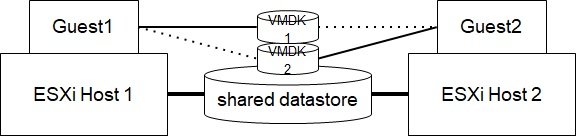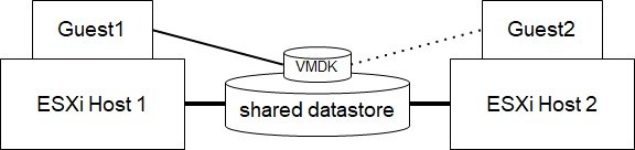 この構成では、ESXi Host 1 にある Guest 1がVMDK Recovery Kit ソフトウェアにより、仮想ハードディスクへアクセスできるため、アクティブとみなされます。Guest 2 は別の処理を実行します。 Guest 1 に障害が発生した場合、Guest 2 が VMDKへのアクセス権を獲得しファイル・システムへアクセスできるようにします。