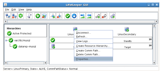 - From the LifeKeeper GUI, right click on one of the cluster nodes and select Properties.