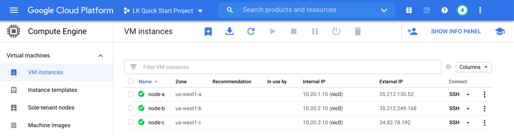The steps required to create the second node (node-b) and third node (node-c) are almost the same as previously described for the first node (node-a). The following table illustrates the differences between the three nodes and the details required to create these instances.