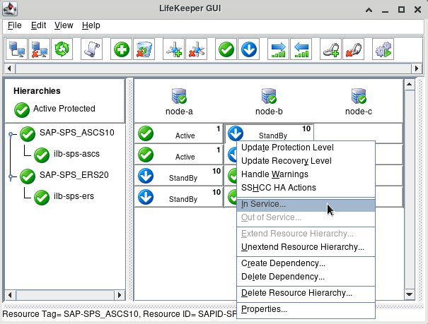 - Perform a switchover of the ASCS resource hierarchy by right-clicking the SAP-SPS_ASCS10 resource on node-b and choosing the In-Service… operation. Click In Service to begin the switchover.