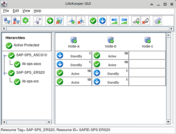 Once node-b is back online, LifeKeeper will automatically relocate the SAP-SPS_ERS20 resource hierarchy back to node-b. Once this process is complete, the SAP-SPS_ASCS10 and SAP-SPS_ERS20 resource hierarchies will be back in-service on node-a and node-b, respectively.