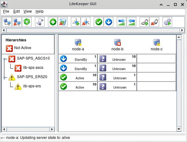 Once LifeKeeper has detected that node-b has been powered off, the status of node-b updates to “Unknown” in the LifeKeeper GUI and LifeKeeper initiates failover of the SAP-SPS_ASCS10 resource hierarchy back to node-a.