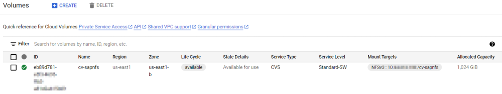 The cv-sapnfs Cloud Volume will appear on the Cloud Volumes → Volumes page once it has been successfully provisioned.