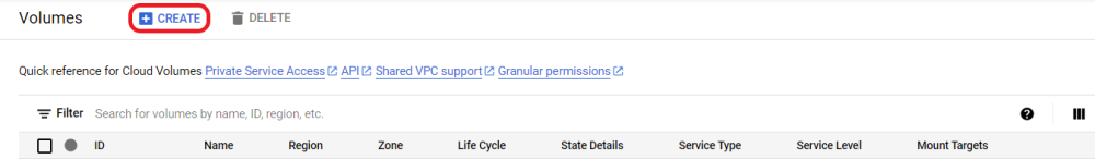 - Once the Cloud Volumes Service has been successfully enabled, navigate to the Cloud Volumes → Volumes page and click Create at the top to create a new Cloud Volume.