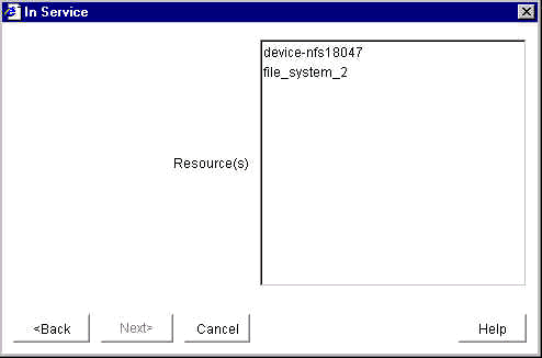 Select a Resource. The second dialog provides a drop-down list box containing the names of all the available resources on the server you selected in the previous dialog. Select the resource that you want to bring into service.