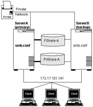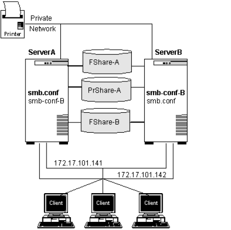 - The clients connect to the Samba servers using the NetBIOS name LKServerA and LKServerB over the protected IP addresses (172.17.101.141 and 172.17.101.142 respectively), which are defined by the interfaces directive of the configuration files.