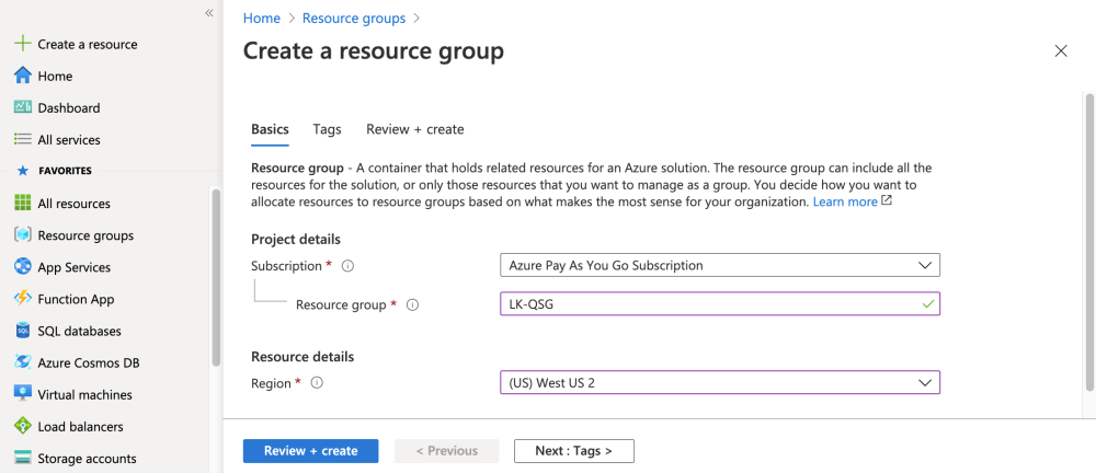 - Specify the name of Resource group as LK-QSG, then select the Region to create the resource group. Note that the region used to create the resource group must have 3 availability zones.