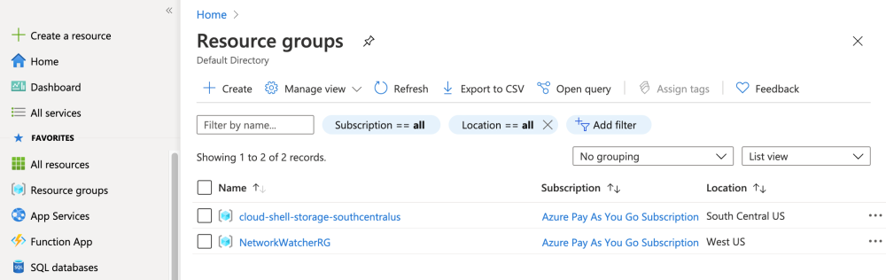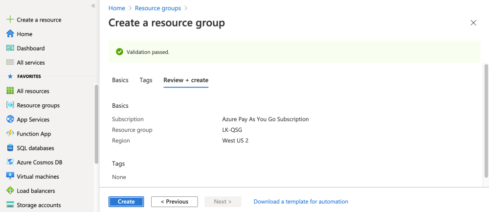 - Select “Resource groups” from the home screen to browse the list of existing resource groups, then click “Create” located at the top.