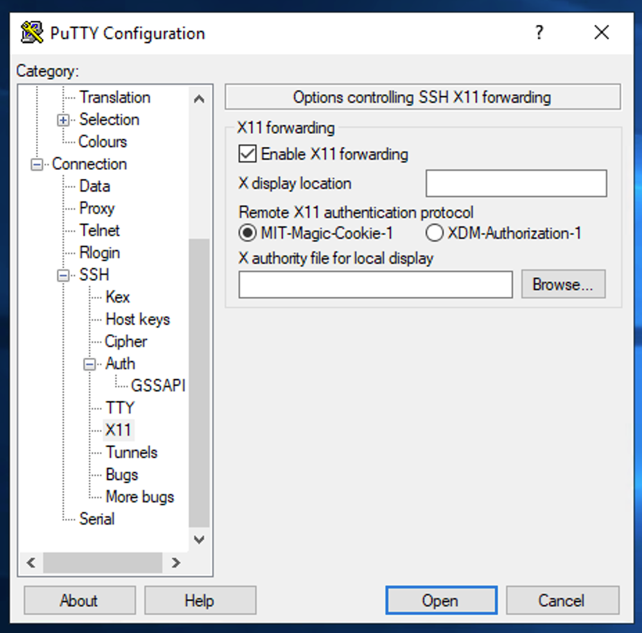 After following the steps in Connecting to a Linux Node from Windows Client Using ssh, PuTTY has been installed and configured. This following explains how to enable X11 forwarding so that it is possible to connect with nodes and use GUI based applications.