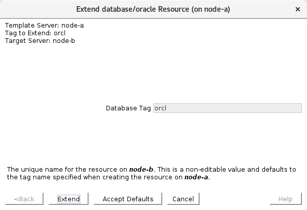 - On the “Extend database/oracle Resource” wizard, the first choice is selecting the Database Tag. Confirm the default value and click “Extend”.