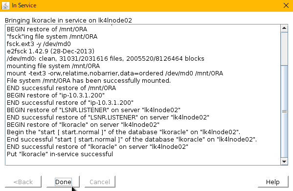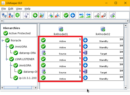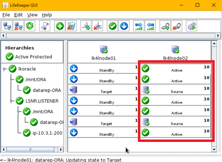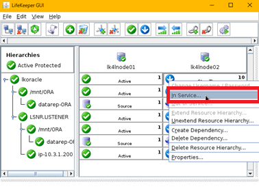 - Switch over the Oracle Database resource from the LifeKeeper GUI. Right-click the Oracle Database resource and select In Service.