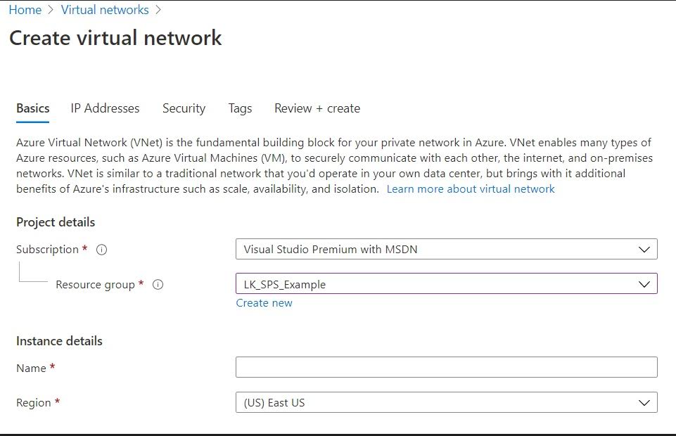 - Select Azure Portal > Virtual networks > Add to create the virtual network and one subnet at a time for this environment.