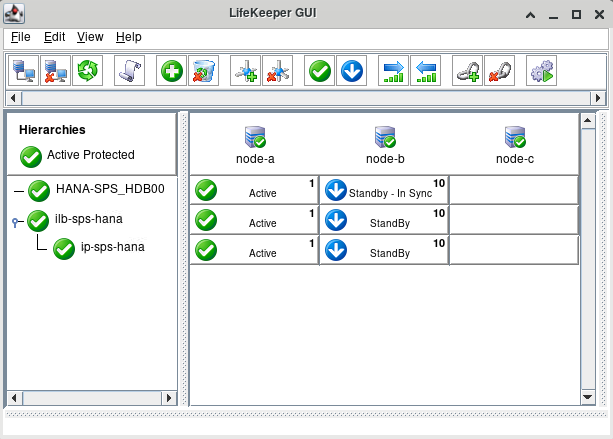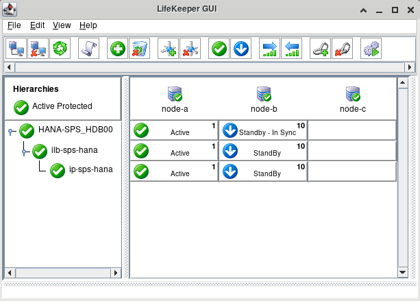 Once the HANA-SPS_HDB00 resource has been successfully created and extended to node-b, the LifeKeeper resource panel should look similar to the following.