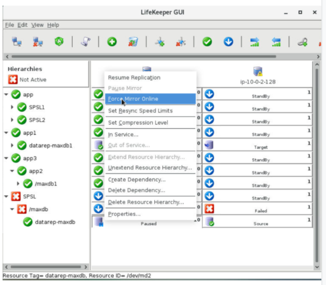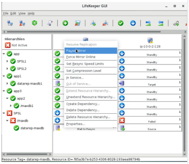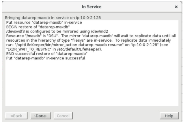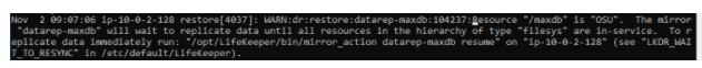 WARN:dr:recover:datarep-maxdb:104237:Mirror “datarep-maxdb” will wait to reconnect targets until parent file system “/maxdb” is in-service. To reconnect targets immediately run: “/opt/LifeKeeper/bin/mirror_action datarep-maxdb resume” on “ip-10-0-2-128” (see “LKDR_WAIT_FOR_FILE_SYSTEM_TO_MOUNT” in /etc/default/LifeKeeper).