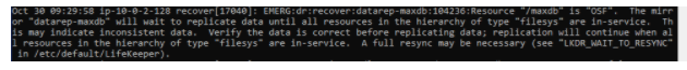 EMERG:dr:recover:datarep-maxdb:104236:Resource “/maxdb” is “OSF”. The mirror “datarep-maxdb” will wait to reconnect targets until parent file system “/maxdb” is in-service. This may indicate inconsistent data. Do not bring the resource “/maxdb” in-service until the data has been verified; replication will continue when “/maxdb” is in-service. A full resync may be necessary (see “LKDR_WAIT_FOR_FILE_SYSTEM_TO_MOUNT” in /etc/default/LifeKeeper).