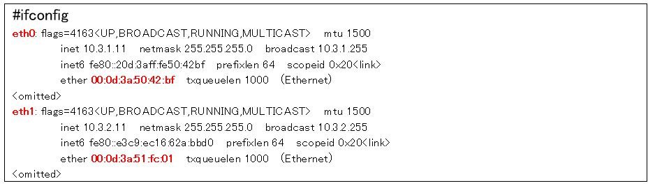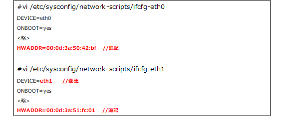 - eth0、eth1 それぞれの設定ファイルを編集します。HWADDR には、前の手順で控えた値を使用します。