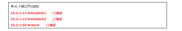 - /etc/hosts に、クラスターノード(稼働系)、クラスターノード(待機系)クライアント兼 Witness サーバー3台の情報を登録します。