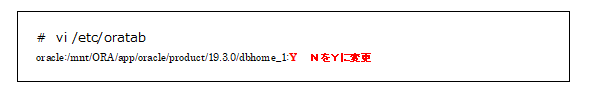 - 続いて、/etc/oratabを修正します。なお、本設定は後の手順で元に戻します。