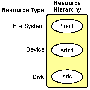 リソース階層により指定された依存関係は、リソースインスタンスを In Service と Out of Service にする適切な順序を LifeKeeper に示します。このリソース階層の例では、 diskdevice のインスタンスを正常に In Service にするまで、LifeKeeper は /usr1 リソースを In Service にすることができません。